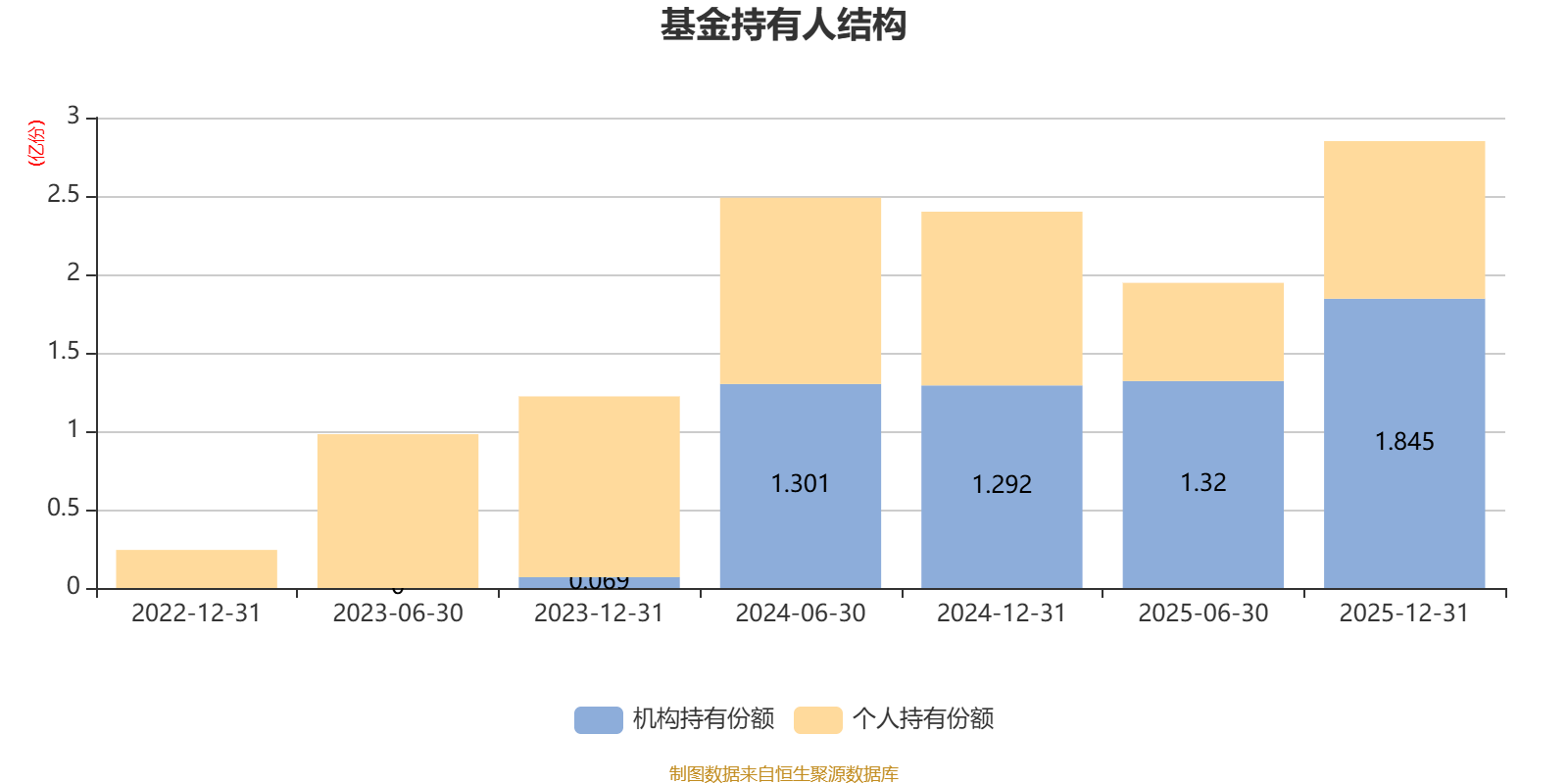 截至2025年12月31日,基金持有人共计1.49万户,合计持有2.85亿份。其中管理人员工持有651.26万份,占比2.29%,机构持有份额占比64.74%,个人投资者占比35.26%。