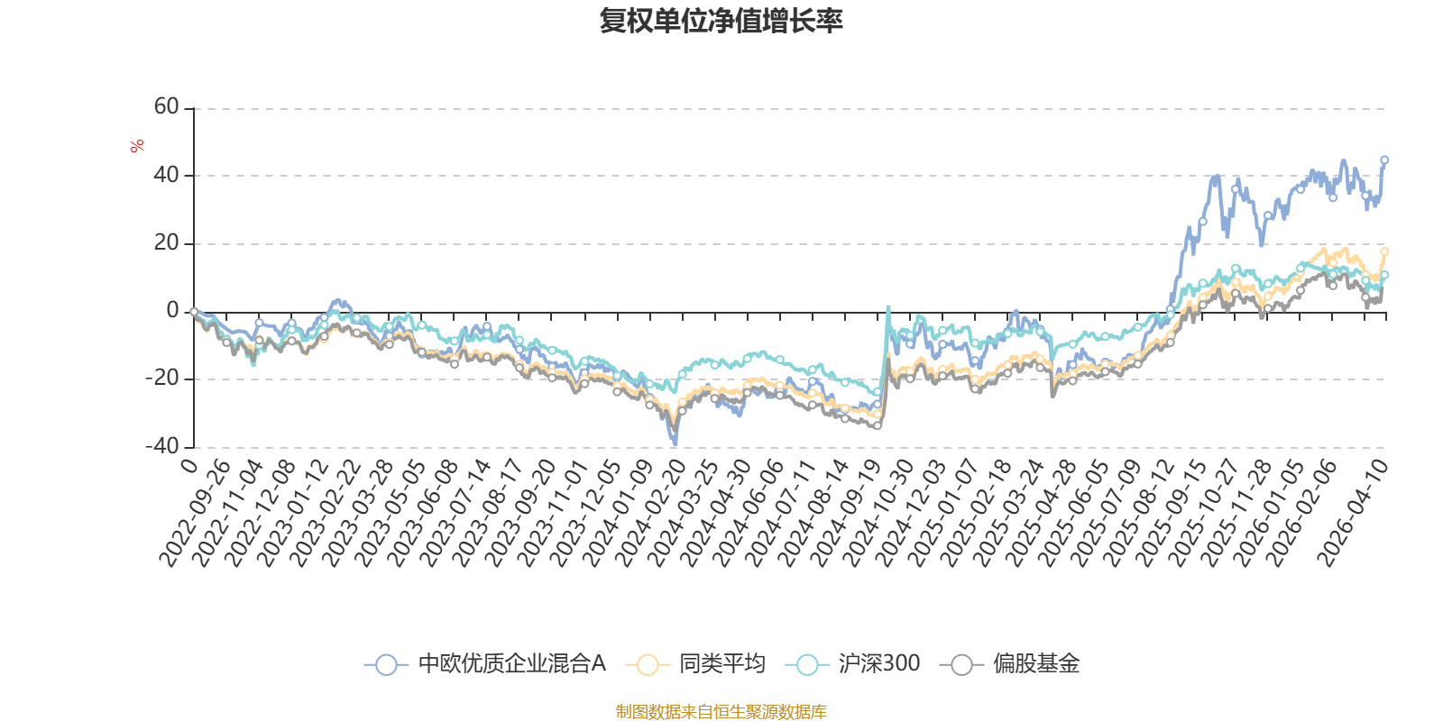 截至4月10日,中欧优质企业混合A近三个月复权单位净值增长率为5.42%,位于同类可比基金21/130;近半年复权单位净值增长率为8.36%,位于同类可比基金43/130;近一年复权单位净值增长率为82.05%,位于同类可比基金13/130;近三年复权单位净值增长率为50.60%,位于同类可比基金16/126。