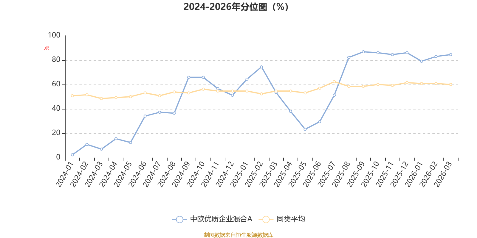 通过所选区间该基金净值增长率分位图,可以观察该基金与同类基金业绩比较情况。图为坐标原点到区间内某时点的净值增长率在同类基金中的分位数。