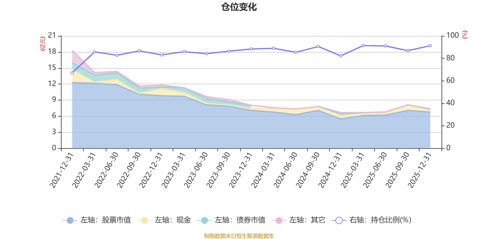 据定期报告数据统计,近三年平均股票仓位为87.7%,同类平均为86.12%。2025年一季度末基金达到91.35%的最高仓位,2021年末最低,为67.08%。