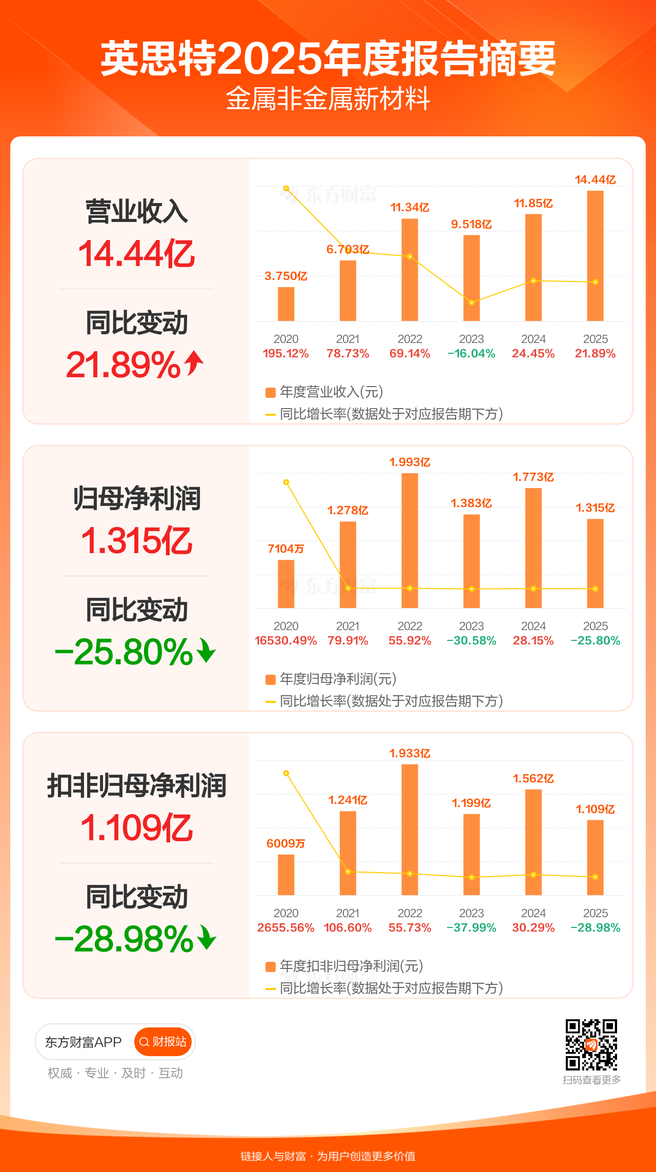英思特4月14日发布2025年年报显示,公司全年实现营业收入14.44亿元,同比增长21.89%;归母净利润1.32亿元,同比下滑25.80%;扣非归母净利润1.11亿元,同比下滑28.98%。