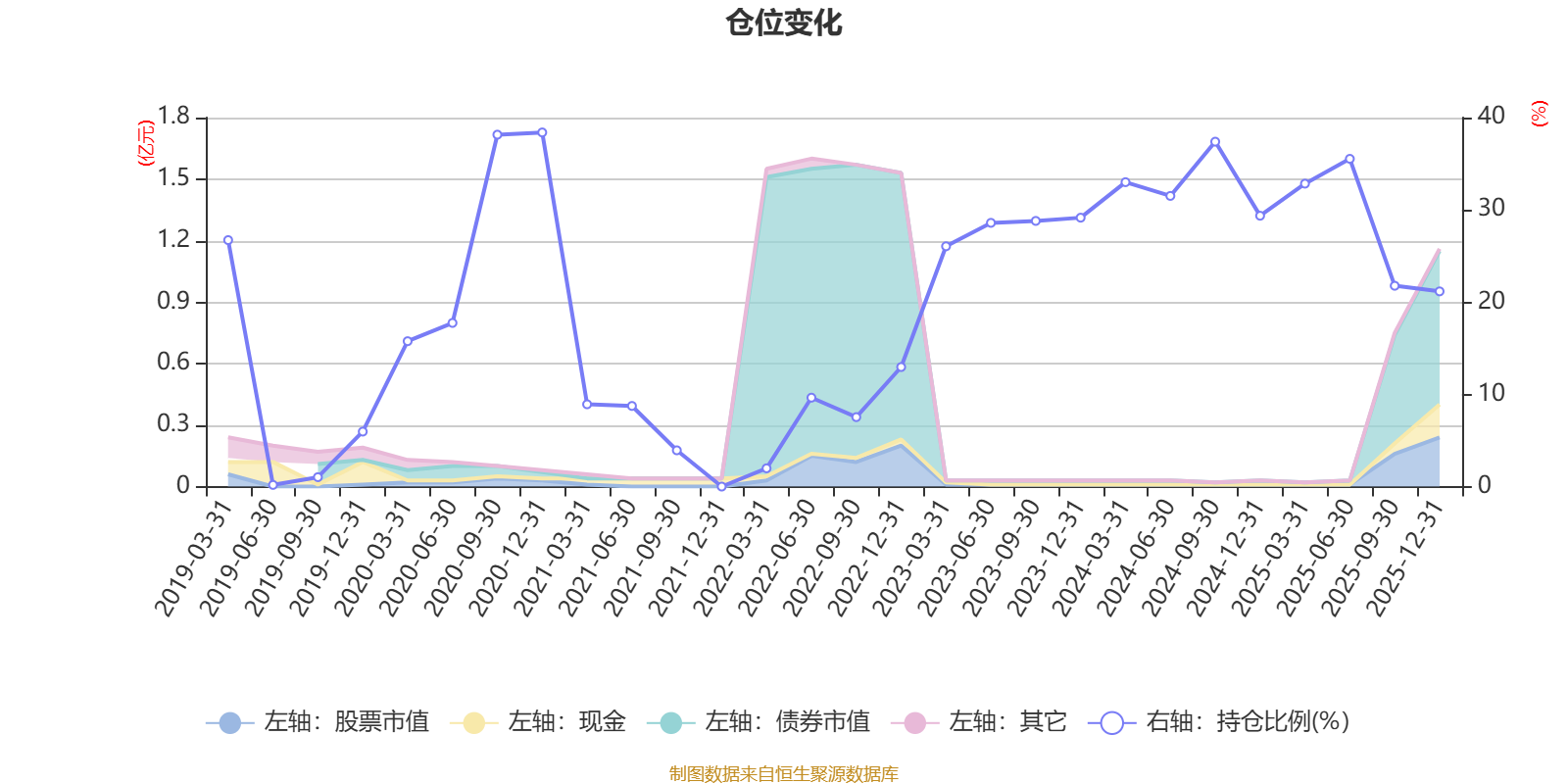 据定期报告数据统计,近三年平均股票仓位为29.6%,同类平均为19.2%。2020年末基金达到38.39%的最高仓位,2019年上半年末最低,为0.18%。