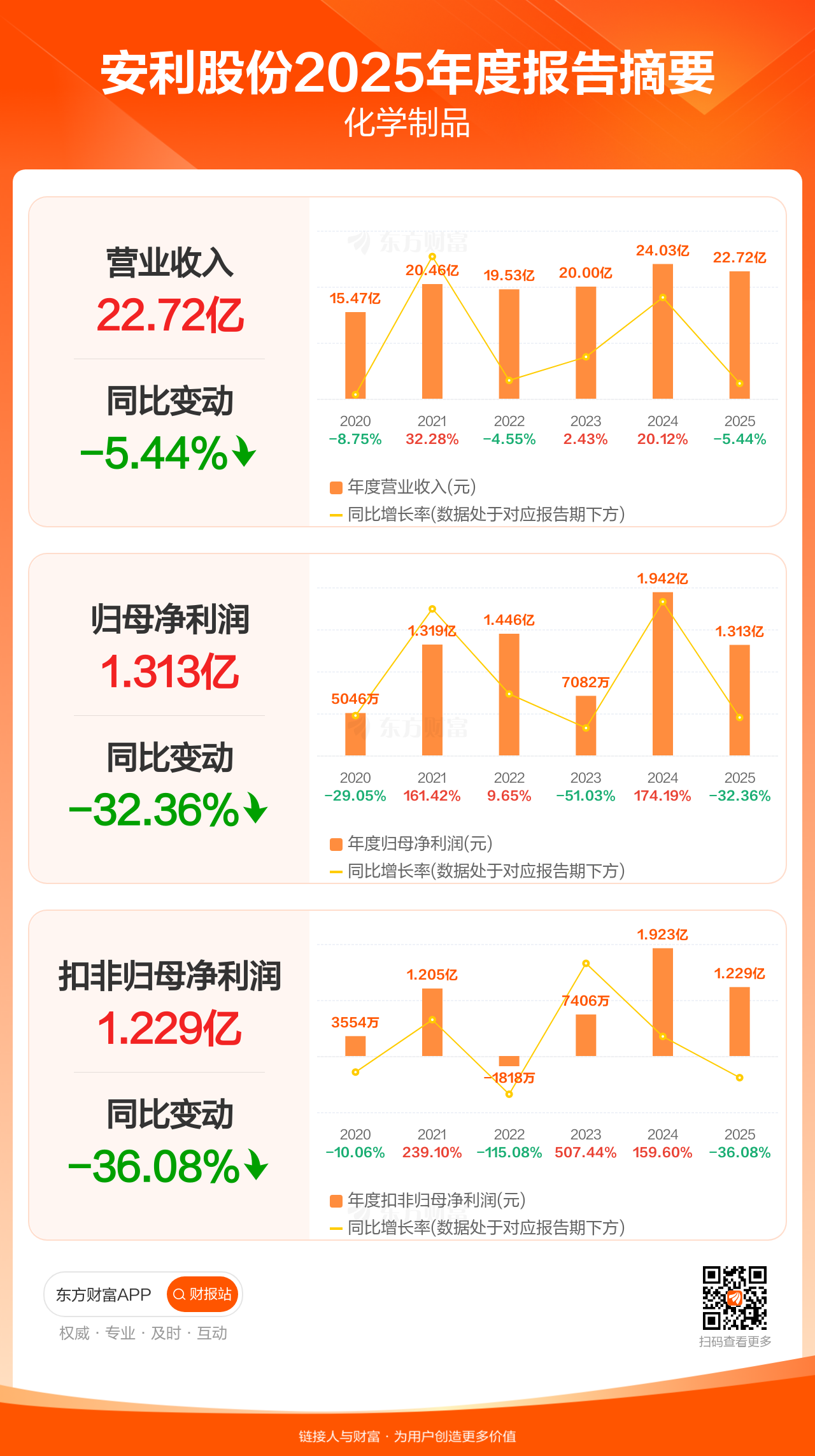 安利股份4月14日发布2025年年报显示,公司全年实现营业收入22.72亿元,同比下滑5.44%;归母净利润1.31亿元,同比下滑32.36%;扣非归母净利润1.23亿元,同比下滑36.08%。