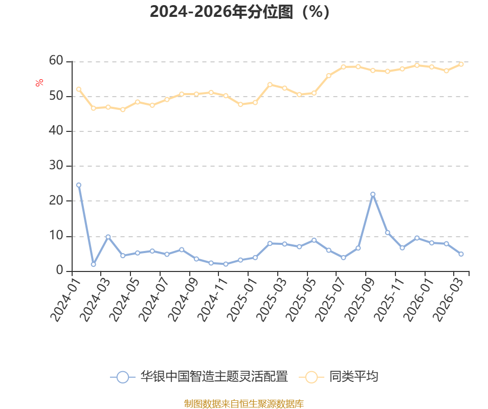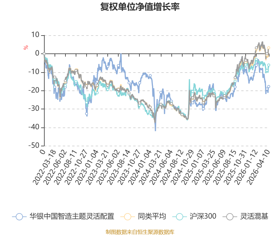 截至4月10日,华银中国智造主题灵活配置近三个月复权单位净值增长率为-11.99%,位于同类可比基金1225/1287;近半年复权单位净值增长率为-13.89%,位于同类可比基金1261/1286;近一年复权单位净值增长率为14.88%,位于同类可比基金947/1286;近三年复权单位净值增长率为-14.44%,位于同类可比基金1163/1286。