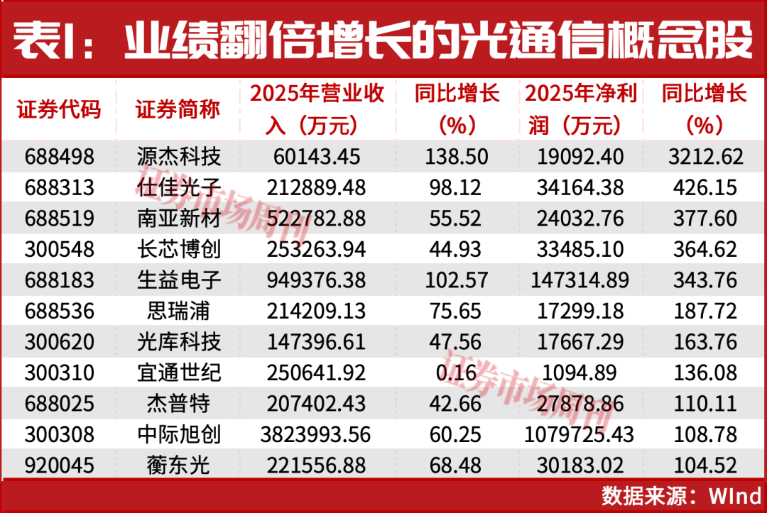结合2025年业绩来看,光通信板块可谓全面爆发,净利润同比翻倍增长股比比皆是,源杰科技的归母净利润更是实现了超30倍的同比增长(见表1)。