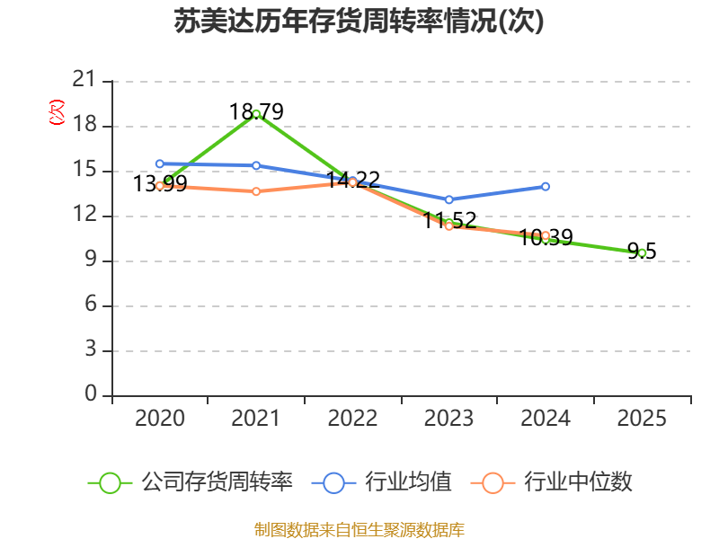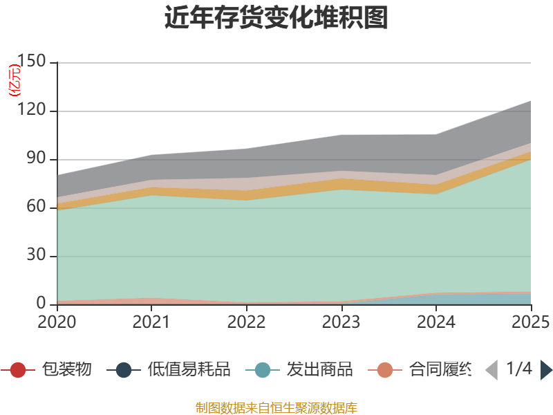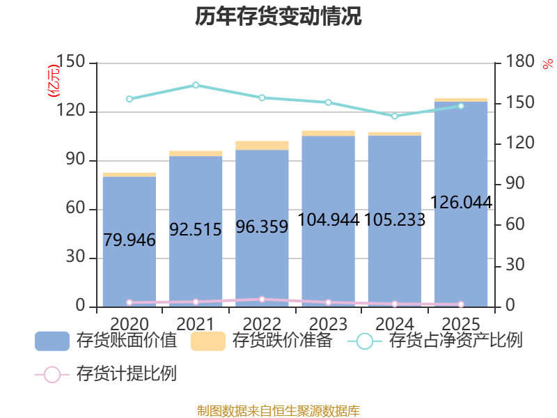 从存货变动来看,截至2025年末,公司存货账面价值为126.04亿元,占净资产的148.03%,较上年末增加20.81亿元。其中,存货跌价准备为2.16亿元,计提比例为1.69%。