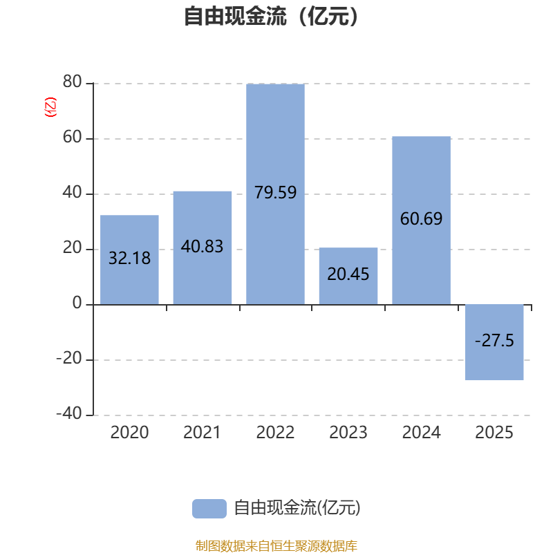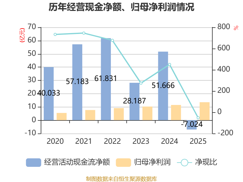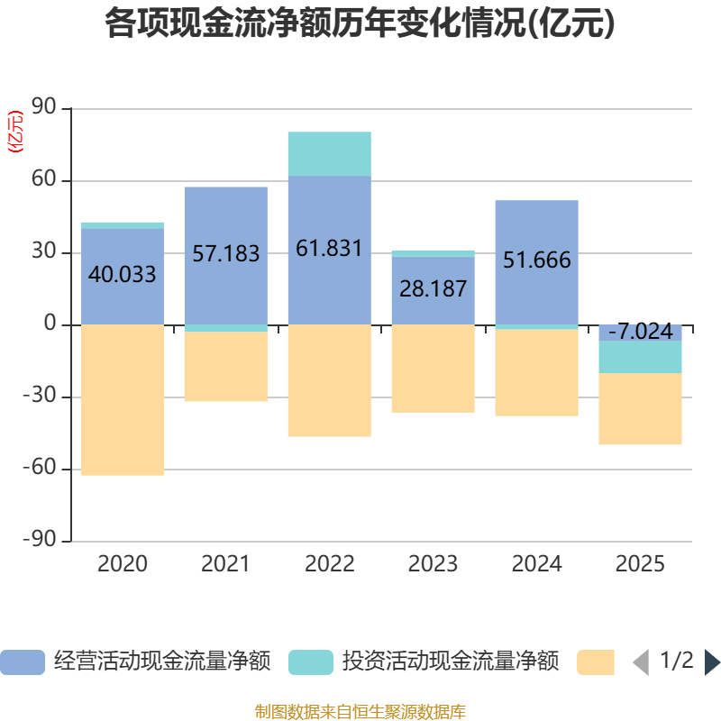 截至2025年,公司经营活动现金流净额为-7.02亿元,同比减少58.69亿元;筹资活动现金流净额-29.7亿元,同比增加6.29亿元;投资活动现金流净额-13.26亿元,上年同期为-2.14亿元。