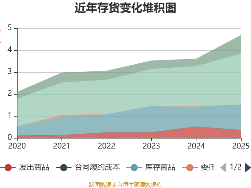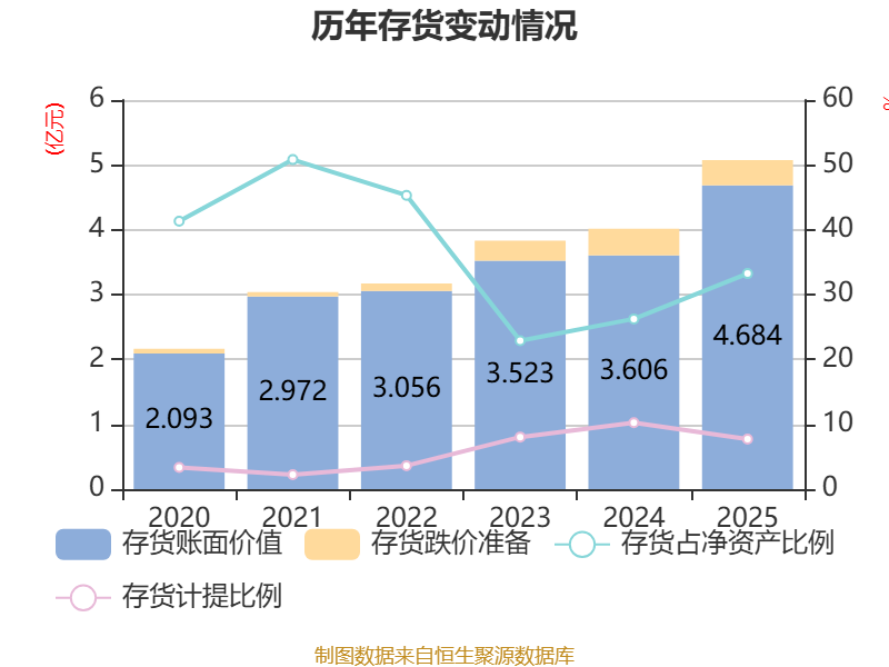 从存货变动来看,截至2025年末,公司存货账面价值为4.68亿元,占净资产的33.24%,较上年末增加1.08亿元。其中,存货跌价准备为3914.96万元,计提比例为7.71%。