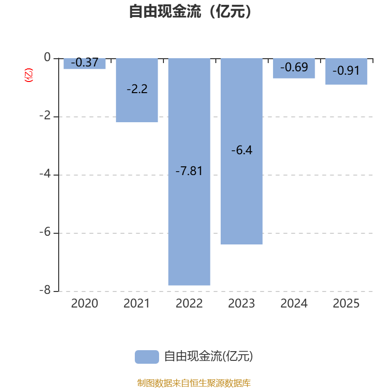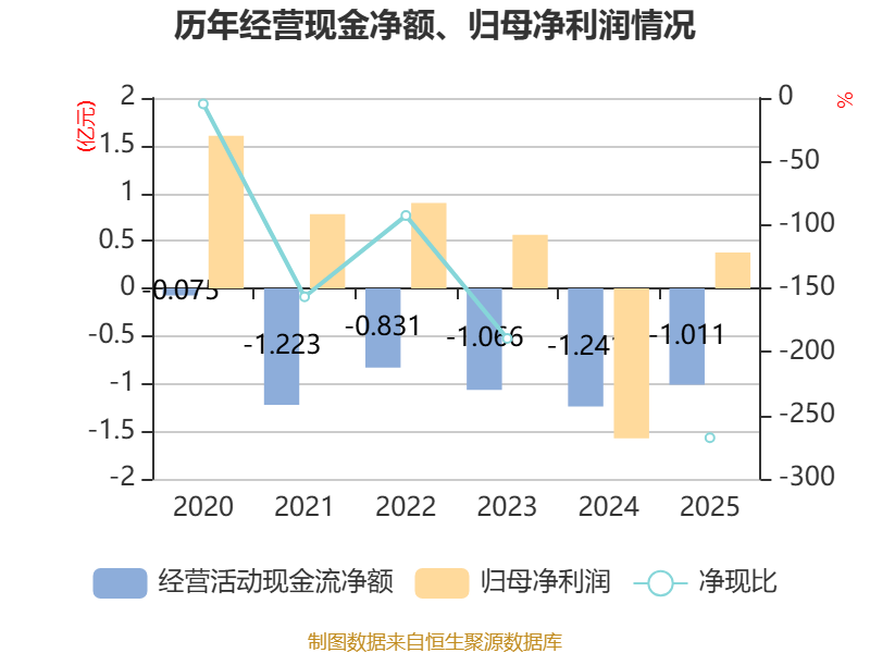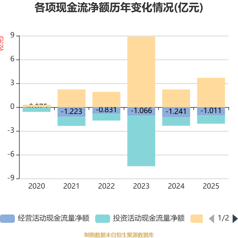 截至2025年,公司经营活动现金流净额为-1.01亿元,同比增加2298.71万元;筹资活动现金流净额3.69亿元,同比增加1.47亿元;投资活动现金流净额-1.08亿元,上年同期为-1.11亿元。