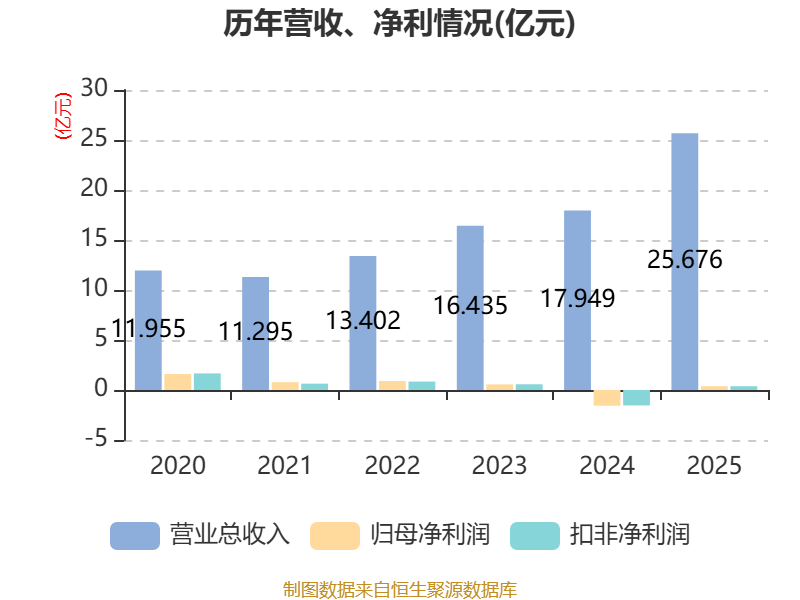 中证智能财讯飞沃科技(301232)4月14日披露2025年年度报告。2025年,公司实现营业总收入25.68亿元,同比增长43.05%;归母净利润3778.98万元,同比扭亏;扣非净利润3772.22万元,同比扭亏;经营活动产生的现金流量净额为-1.01亿元,上年同期为-1.24亿元;报告期内,飞沃科技基本每股收益为0.5元,加权平均净资产收益率为2.72%。公司2025年度分配预案为:拟向全体股东每10股转4股。