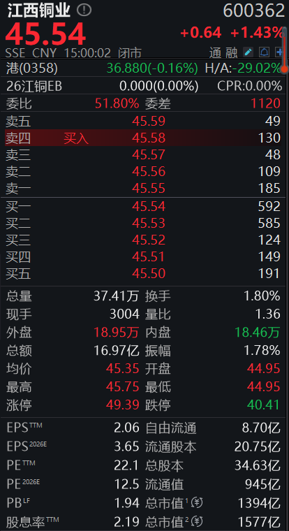 资料显示,江西铜业是江西省属国有控股铜业龙头,也是国内最大综合性铜企,其产业链完成度高,阴极铜、黄金、白银产量位居行业前列,正加快布局新能源材料与海外资源。4月13日,江西铜业收盘价为45.54元/股,对应总市值1577亿元。