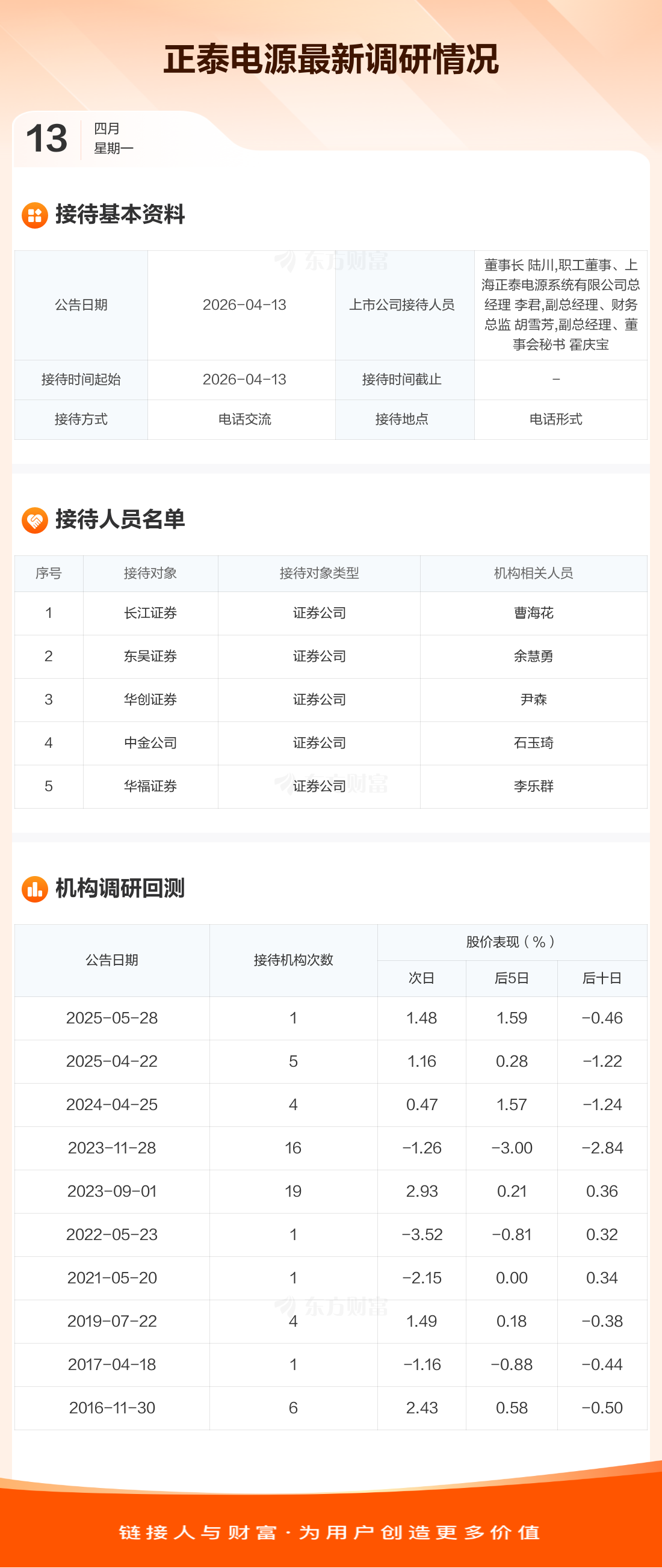 正泰电源4月13日公告称,4月13日接待长江证券等5家机构调研。接待人员包括董事长 陆川,职工董事、上海正泰电源系统有限公司总经理 李君,副总经理、财务总监 胡雪芳,副总经理、董事会秘书 霍庆宝。