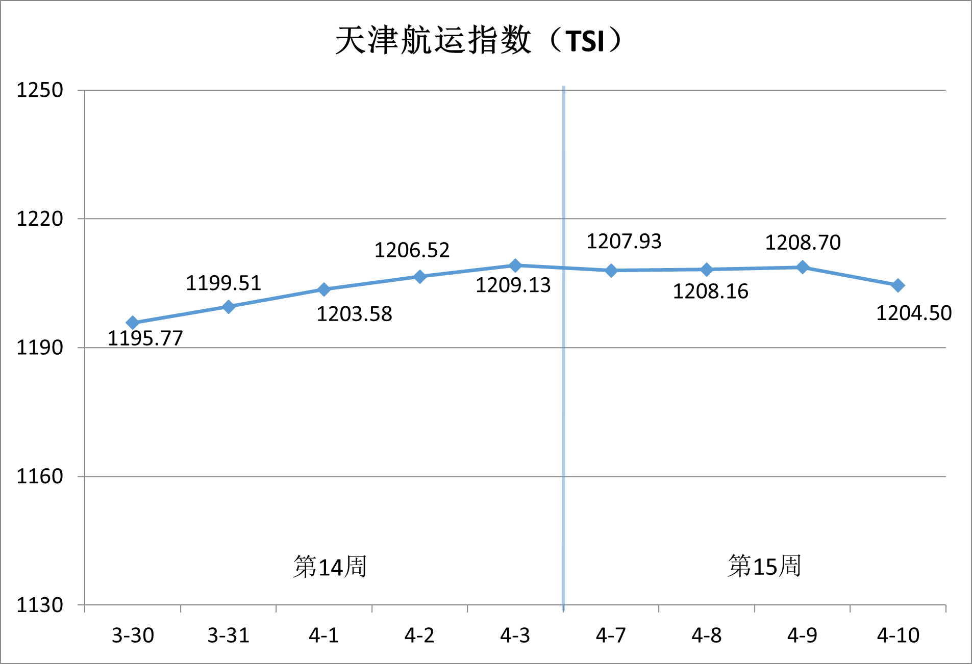 新华财经天津4月13日电(记者李亭) 记者从天津国际贸易与航运服务中心获悉,2026年第15周(4月7日-10日),中国北方内外贸海运价格的风向标——天津航运指数震荡走弱,最终收于1204.50点,相比4月3日(第14周最后一个发布日)累计下跌4.63点,累计跌幅为0.38%。