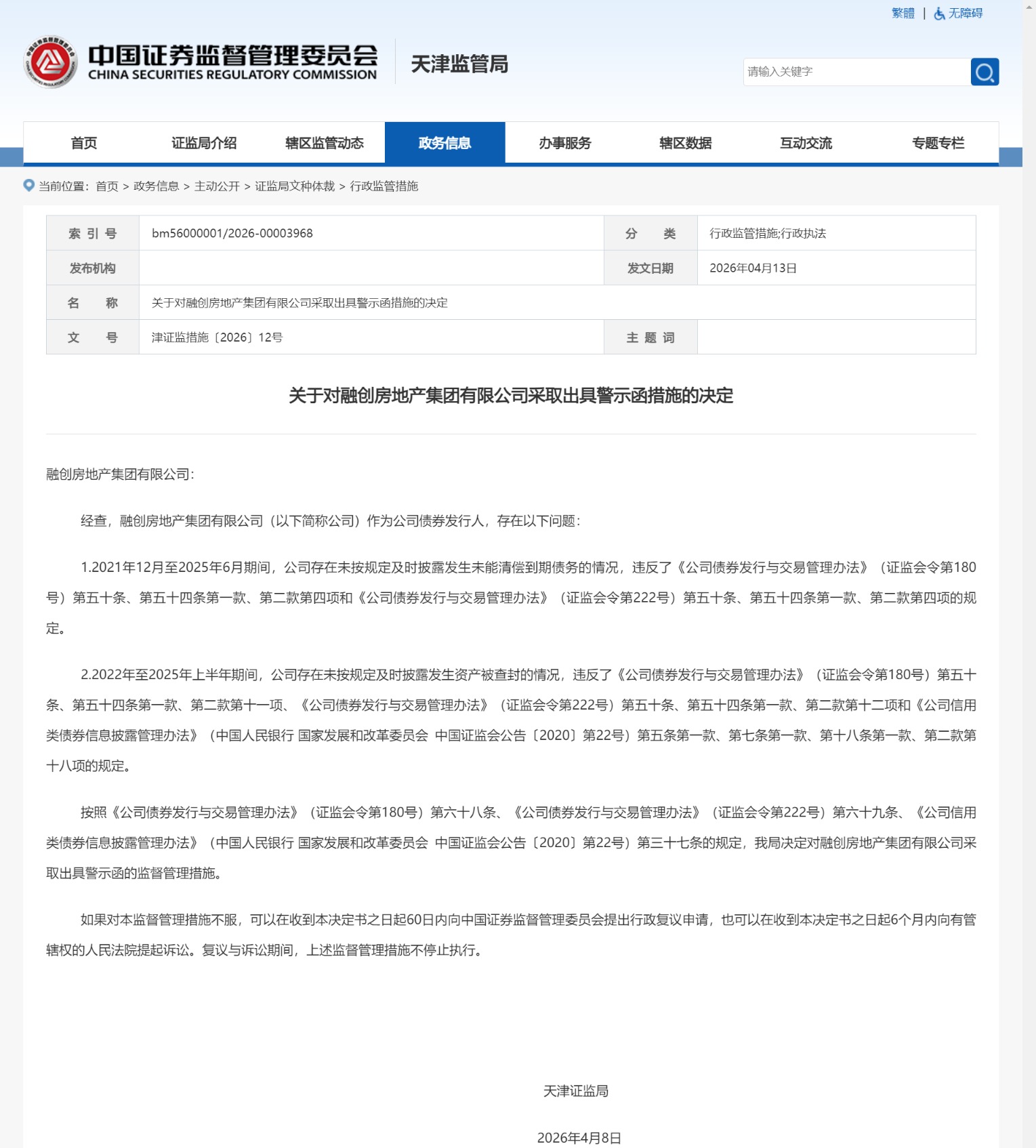按照《公司债券发行与交易管理办法》第六十八条、《公司债券发行与交易管理办法》第六十九条、《公司信用类债券信息披露管理办法》第三十七条的规定,天津证监局决定对融创房地产集团有限公司采取出具警示函的监督管理措施。