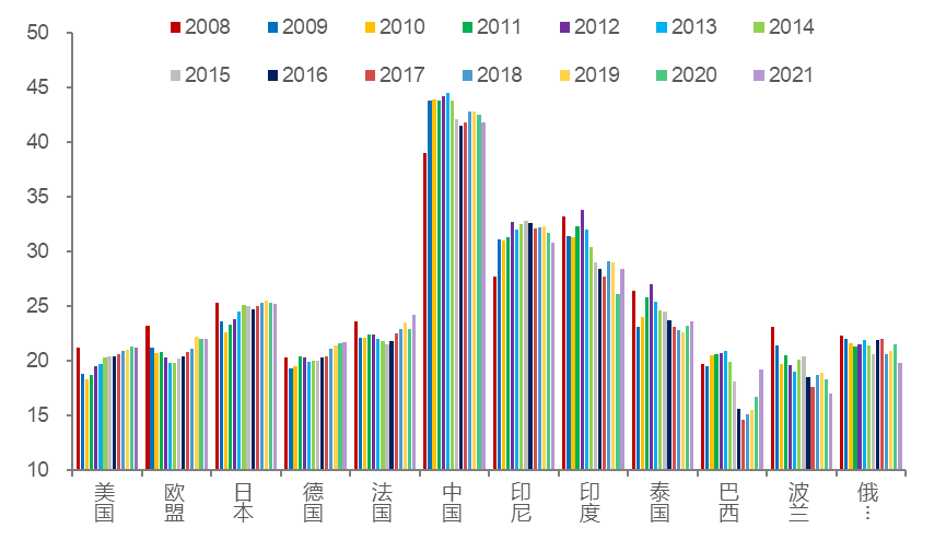 当然,由于我国的具有全球较好的公共医疗体制,居民部门获得较高质量的医疗服务,故我国人口的预期寿命已经接近发达国家的平均水平;与此同时,我国出生人口数量却大幅锐减,总和生育率水平处于全球末端,两大现象可能也是导致未富先老的次要原因。