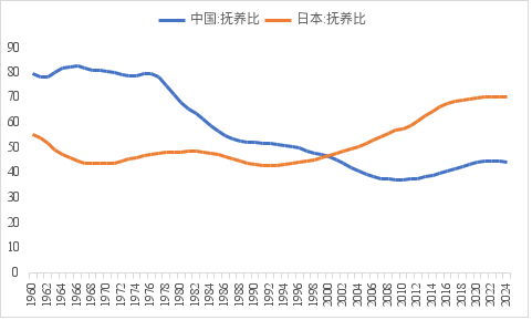 由于70年代开始实行计划生育政策,一直持续了40多年时间,这段时期劳动人口大幅增加,而出生人口却显著下降,使得1977-2010年这44年间抚养比例大幅下降,到2010年降至37.2%。