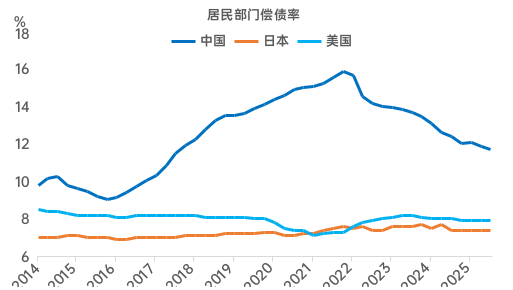 数据显示,中国居民部门偿债率最高时为2021年的四季度,达到15.9%,是日本和美国的两倍以上。这与中国的楼市高点非常吻合。如今我国的偿债率水平已经降至11.7%(2025年三季度),相当于2017年四季度的水平,仍处在历史的较高位置。相比之下,过去10年来,日、美的居民偿债率比较稳定,长期维持在7-8%之间。