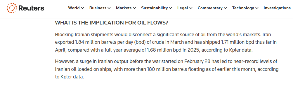 路透社援引Kpler数据称,伊朗3月原油出口为184万桶/日,4月迄今约为171万桶/日;若封锁长期化,全球市场将少掉大约200万桶/日的伊朗原油供应。报道同时提到,仍有超过1.8亿桶伊朗原油在海上处于浮仓状态,波斯湾水域内还有约187艘满载油轮滞留。