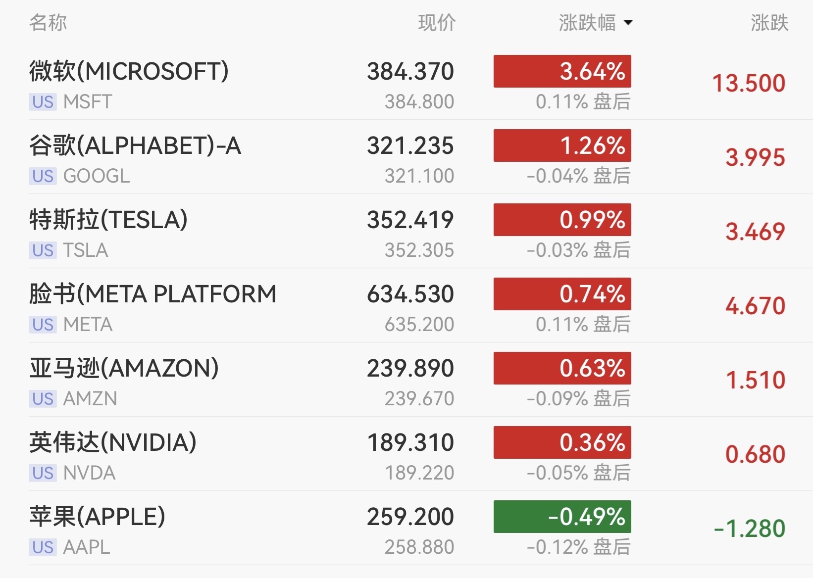 龙头科技股普遍上涨。微软收涨3.64%,谷歌涨1.25%,特斯拉涨0.98%,Meta涨0.74%,亚马逊涨0.63%,英伟达涨0.36%,奈飞涨0.15%。
