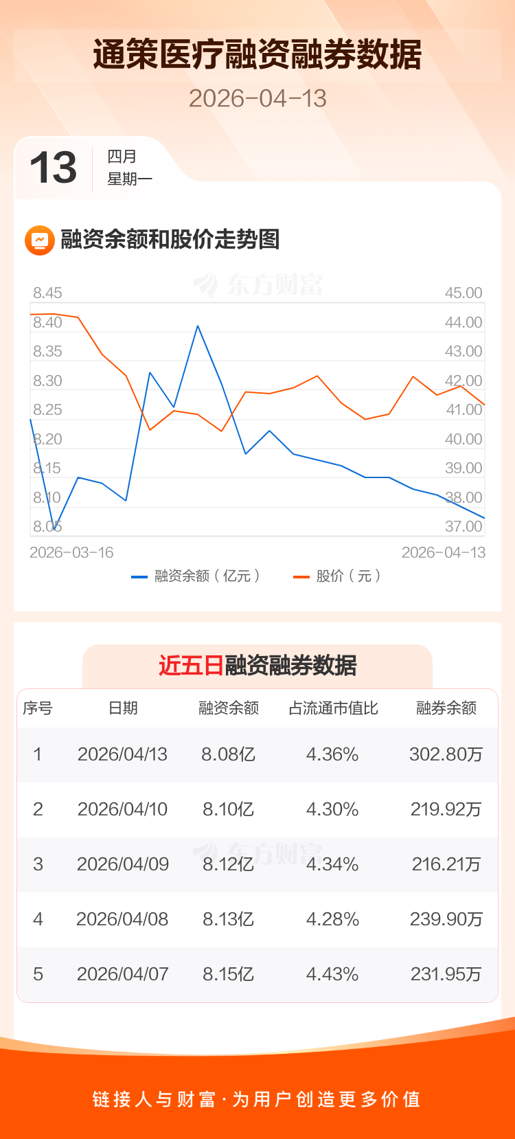 交易所最新数据显示,通策医疗于2026年4月13日获融资买入1975.45万元,融资偿还2162.77万元,当日融资净偿还187.32万元。目前,该股融资余额8.08亿,占流通市值比例为4.36%。