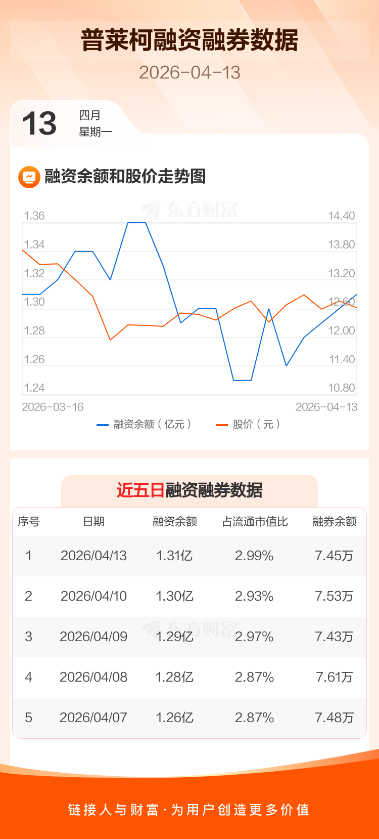 交易所最新数据显示,普莱柯于2026年4月13日获融资买入611.81万元,融资偿还499.49万元,当日融资净买入112.33万元。目前,该股融资余额1.31亿,占流通市值比例为2.99%。