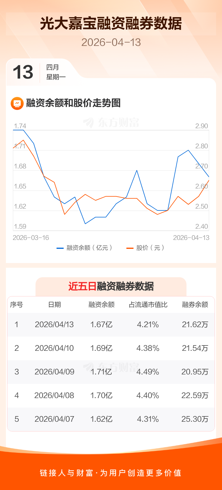 交易所最新数据显示,光大嘉宝于2026年4月13日获融资买入637.19万元,融资偿还766.56万元,当日融资净偿还129.36万元。目前,该股融资余额1.67亿,占流通市值比例为4.21%。