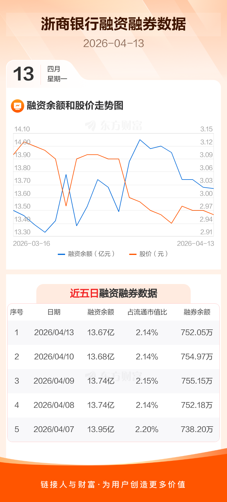 交易所最新数据显示,浙商银行于2026年4月13日获融资买入2261.61万元,融资偿还2356.09万元,当日融资净偿还94.48万元。目前,该股融资余额13.67亿,占流通市值比例为2.14%。
