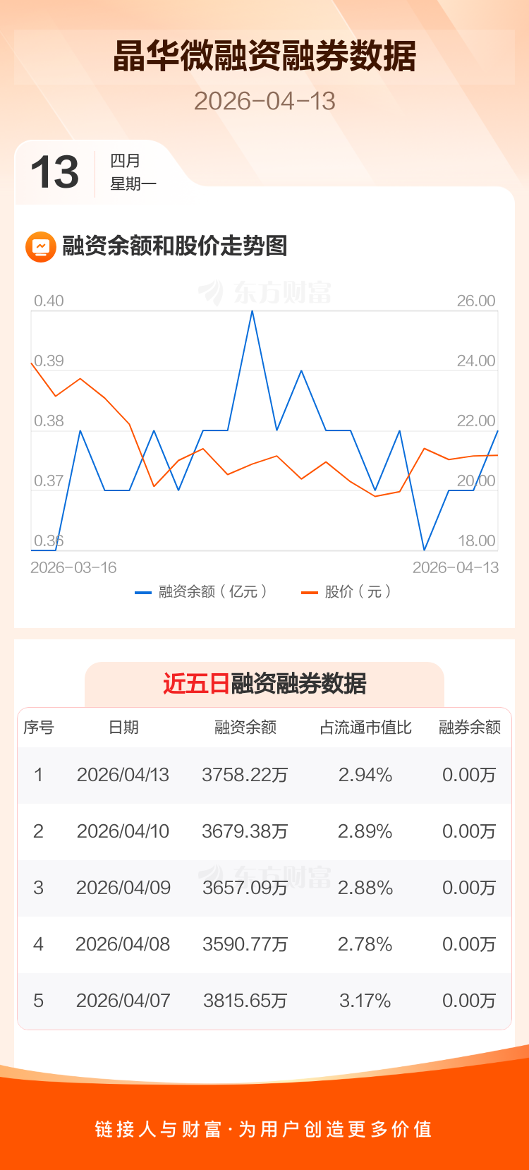 交易所最新数据显示,晶华微于2026年4月13日获融资买入167.21万元,融资偿还88.37万元,当日融资净买入78.84万元。目前,该股融资余额3758.22万,占流通市值比例为2.94%。