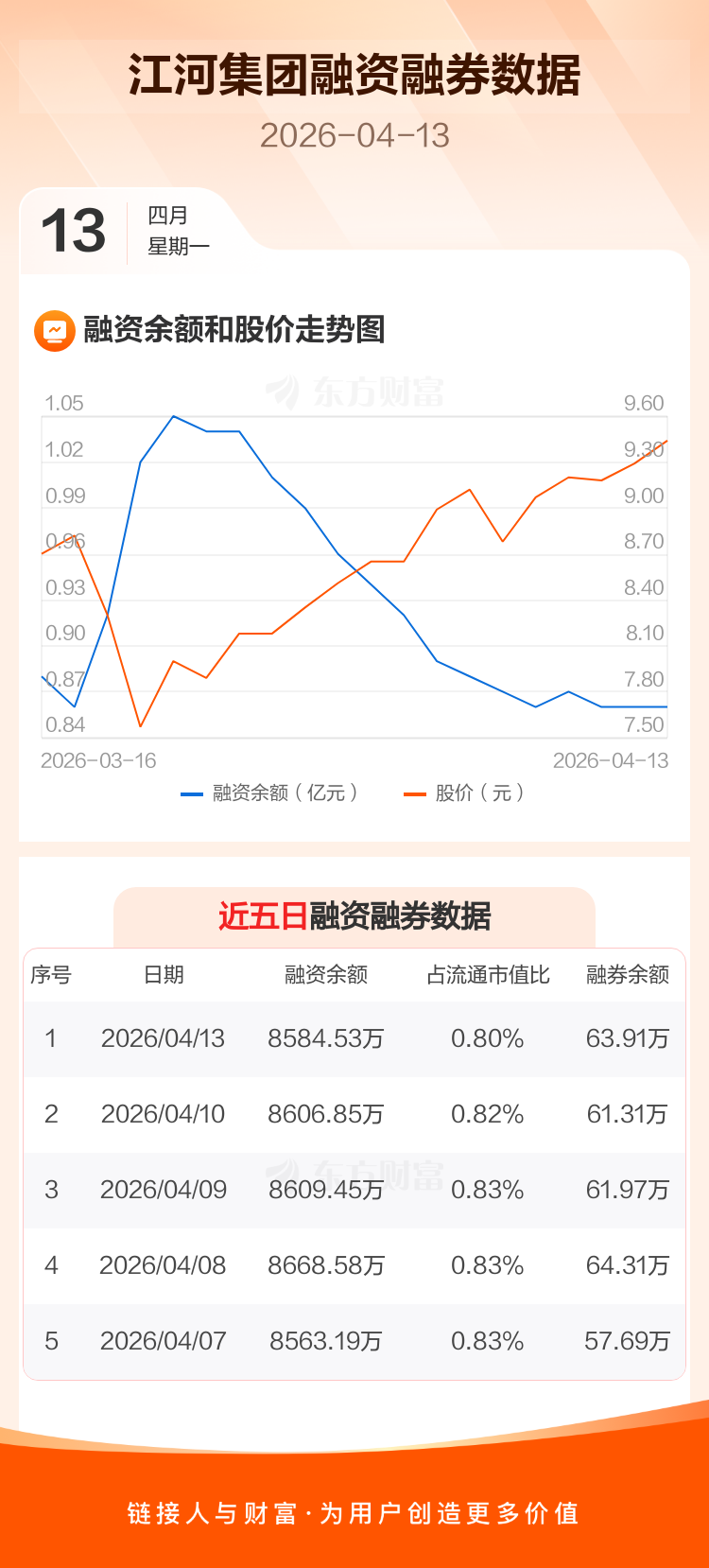 交易所最新数据显示,江河集团于2026年4月13日获融资买入279.91万元,融资偿还302.23万元,当日融资净偿还22.32万元。目前,该股融资余额8584.53万,占流通市值比例为0.80%。