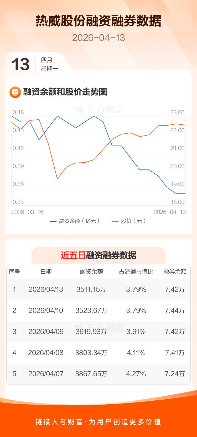 交易所最新数据显示,热威股份于2026年4月13日获融资买入158.13万元,融资偿还170.65万元,当日融资净偿还12.52万元。目前,该股融资余额3511.15万,占流通市值比例为3.79%。