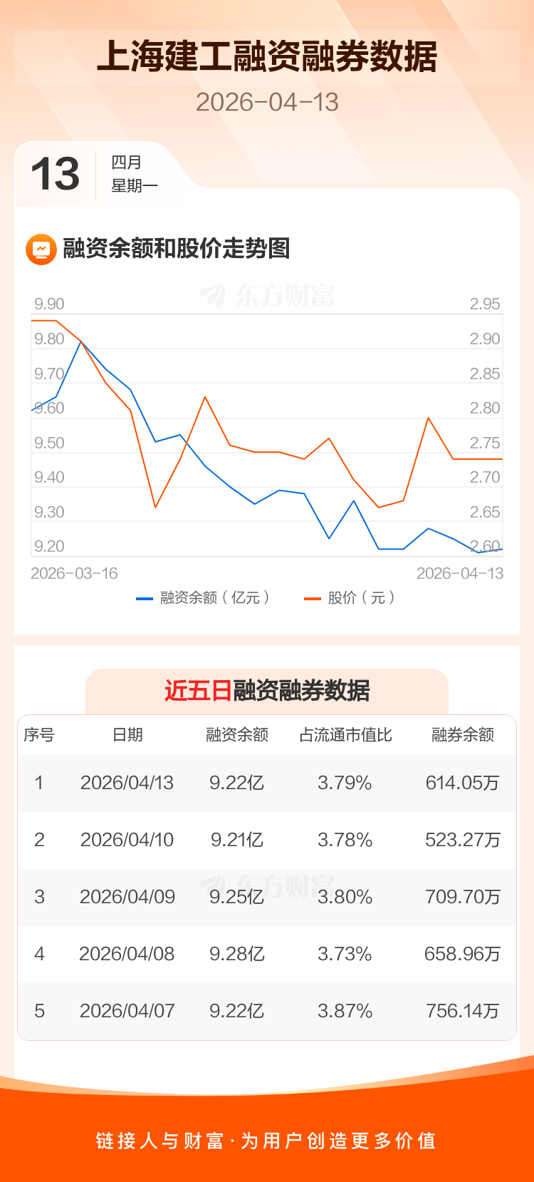 交易所最新数据显示,上海建工于2026年4月13日获融资买入3885.90万元,融资偿还3792.62万元,当日融资净买入93.28万元。目前,该股融资余额9.22亿,占流通市值比例为3.79%。