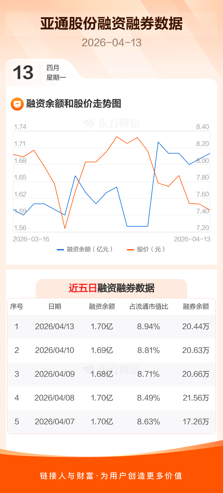 交易所最新数据显示,亚通股份于2026年4月13日获融资买入643.03万元,融资偿还563.63万元,当日融资净买入79.39万元。目前,该股融资余额1.70亿,占流通市值比例为8.94%。