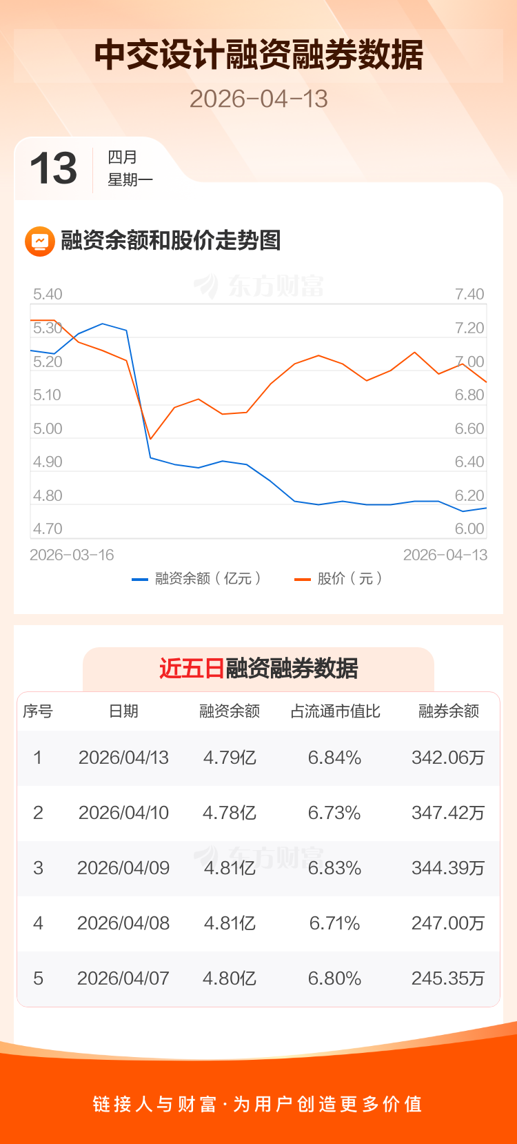 交易所最新数据显示,中交设计于2026年4月13日获融资买入283.39万元,融资偿还244.54万元,当日融资净买入38.85万元。目前,该股融资余额4.79亿,占流通市值比例为6.84%。