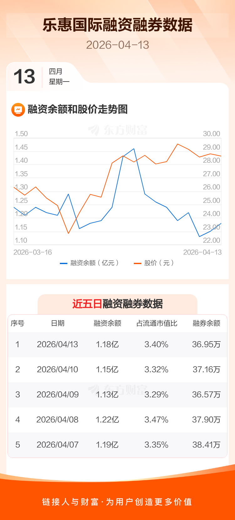 交易所最新数据显示,乐惠国际于2026年4月13日获融资买入1336.73万元,融资偿还1104.61万元,当日融资净买入232.12万元。目前,该股融资余额1.18亿,占流通市值比例为3.40%。