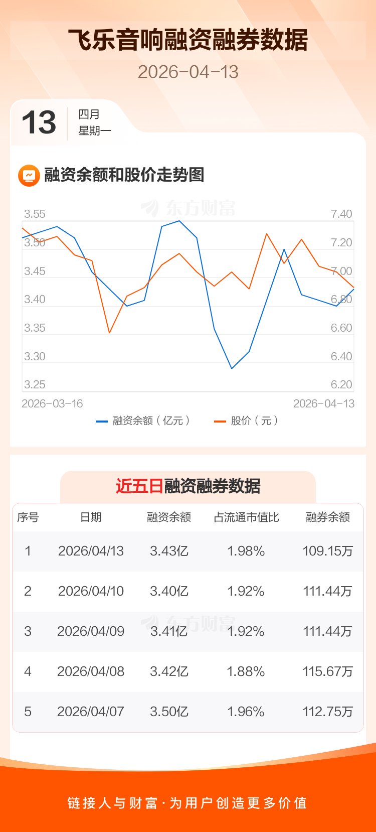 交易所最新数据显示,飞乐音响于2026年4月13日获融资买入1416.20万元,融资偿还1022.54万元,当日融资净买入393.67万元。目前,该股融资余额3.43亿,占流通市值比例为1.98%。