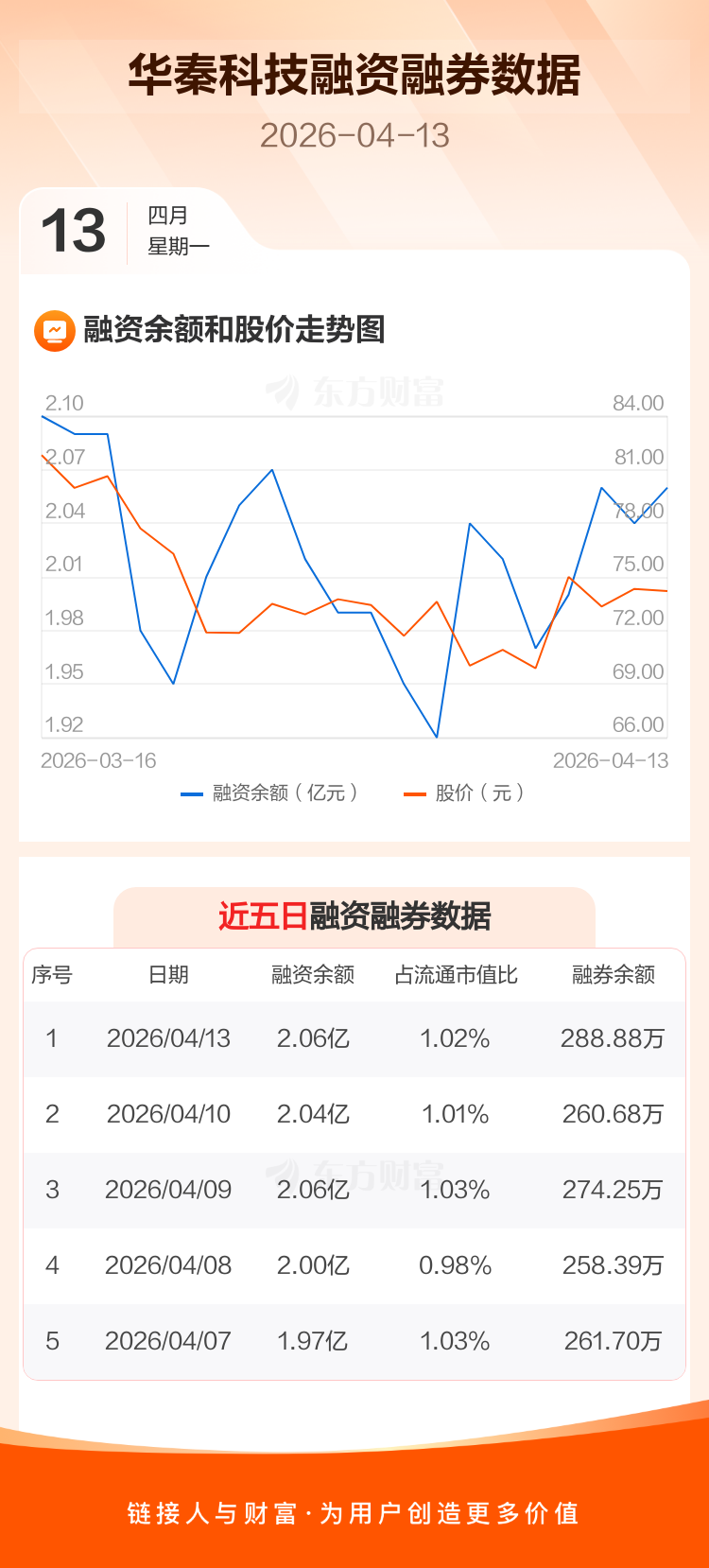 交易所最新数据显示,华秦科技于2026年4月13日获融资买入1492.26万元,融资偿还1217.73万元,当日融资净买入274.53万元。目前,该股融资余额2.06亿,占流通市值比例为1.02%。