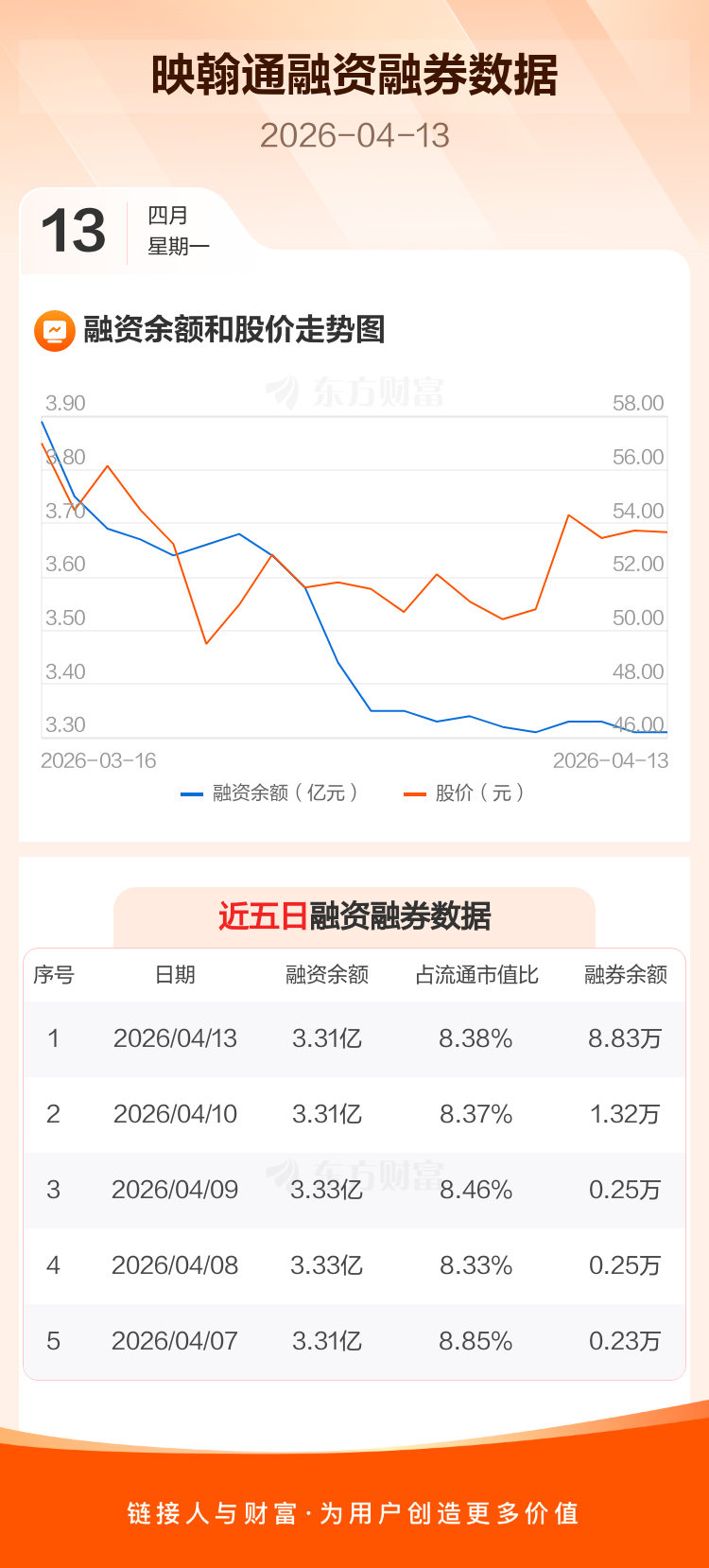 交易所最新数据显示,映翰通于2026年4月13日获融资买入596.15万元,融资偿还577.70万元,当日融资净买入18.45万元。目前,该股融资余额3.31亿,占流通市值比例为8.38%。