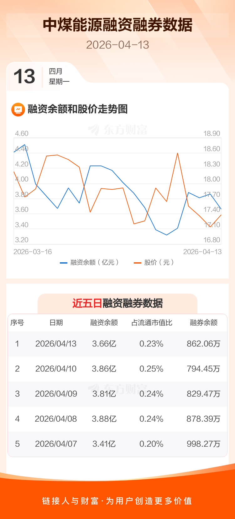 交易所最新数据显示,中煤能源于2026年4月13日获融资买入3818.29万元,融资偿还5810.89万元,当日融资净偿还1992.6万元。目前,该股融资余额3.66亿,占流通市值比例为0.23%。