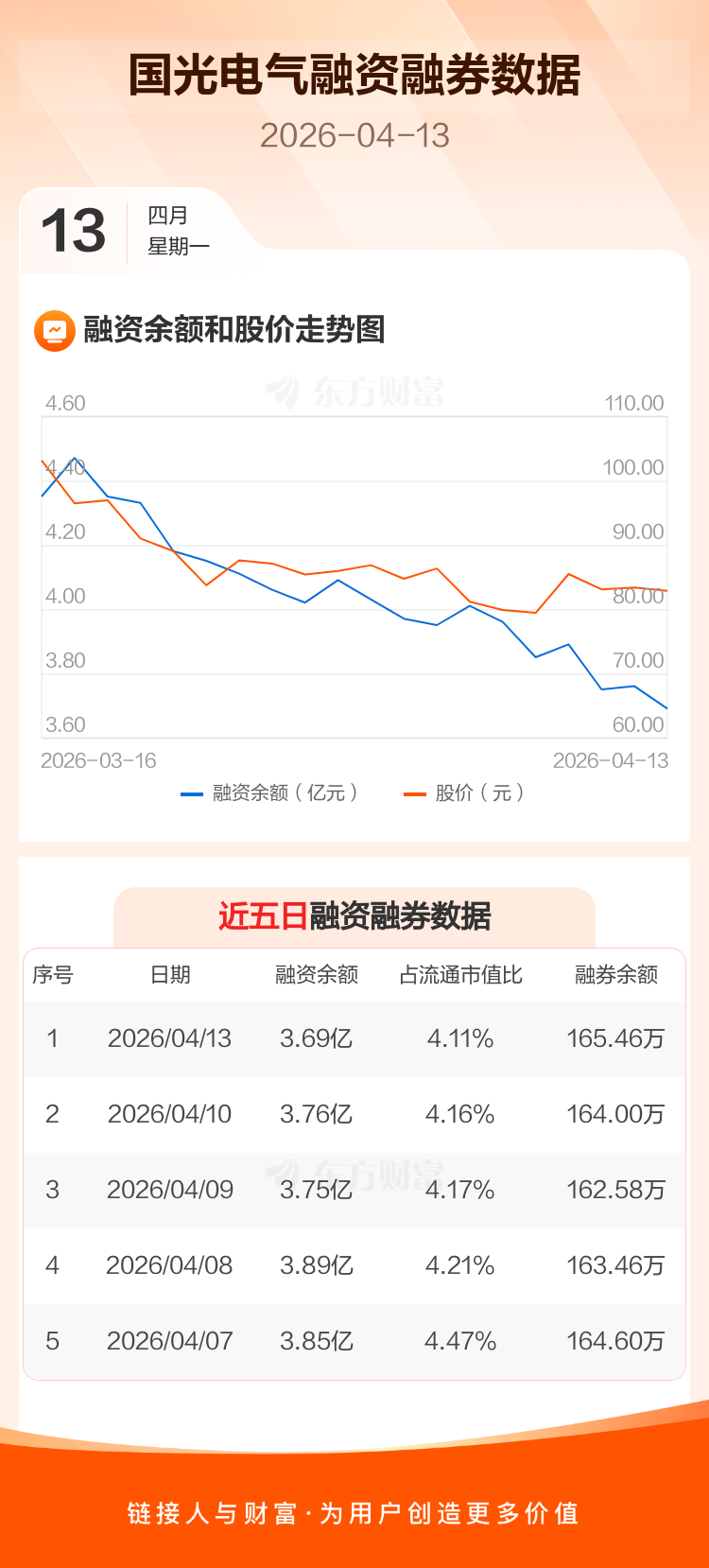 交易所最新数据显示,国光电气于2026年4月13日获融资买入744.80万元,融资偿还1451.89万元,当日融资净偿还707.09万元。目前,该股融资余额3.69亿,占流通市值比例为4.11%。