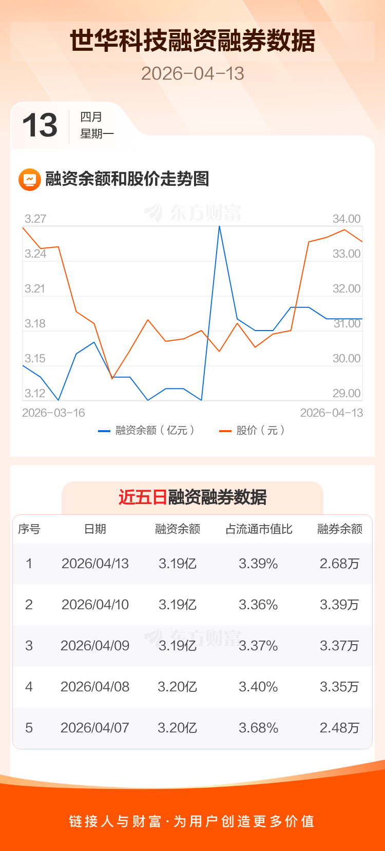 交易所最新数据显示,世华科技于2026年4月13日获融资买入863.25万元,融资偿还910.37万元,当日融资净偿还47.12万元。目前,该股融资余额3.19亿,占流通市值比例为3.39%。