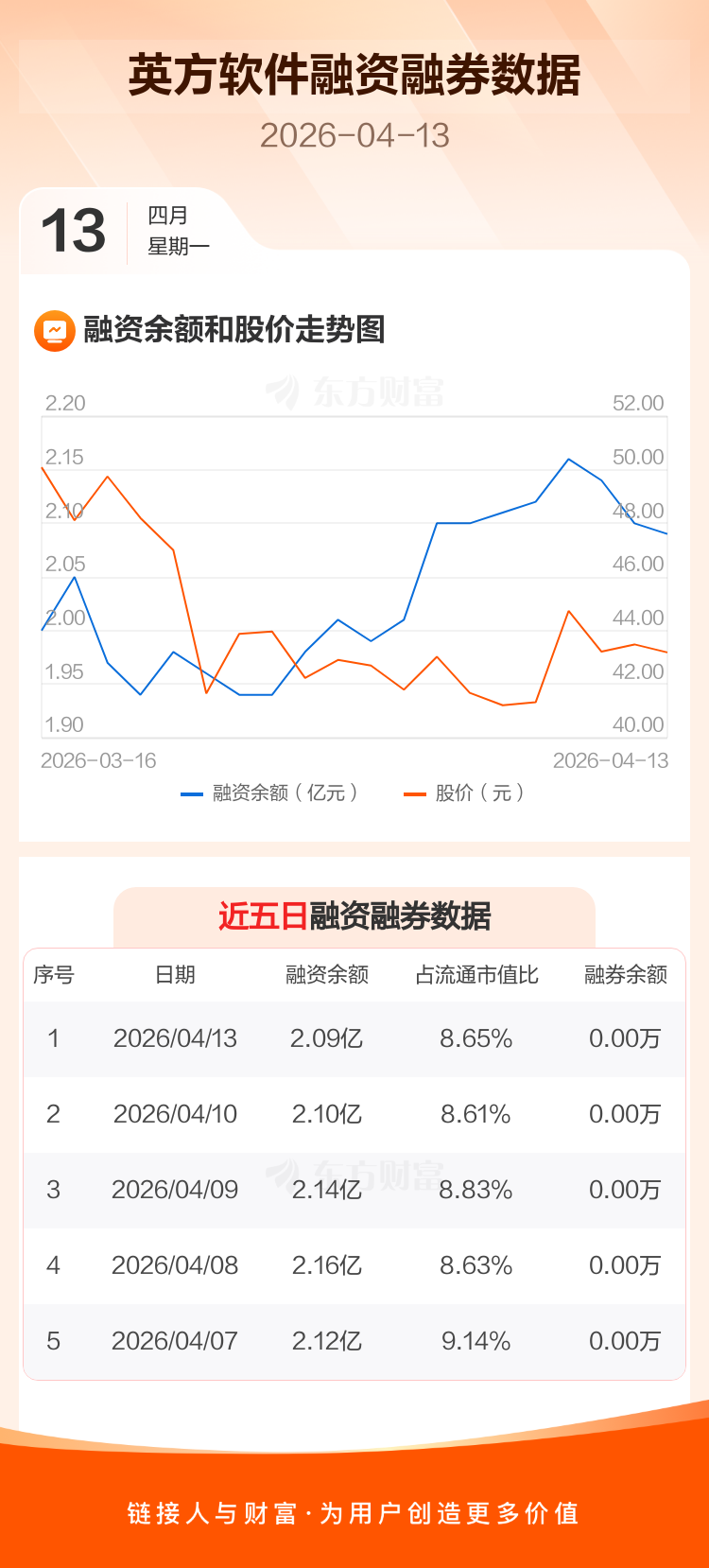交易所最新数据显示,英方软件于2026年4月13日获融资买入452.84万元,融资偿还502.68万元,当日融资净偿还49.84万元。目前,该股融资余额2.09亿,占流通市值比例为8.65%。