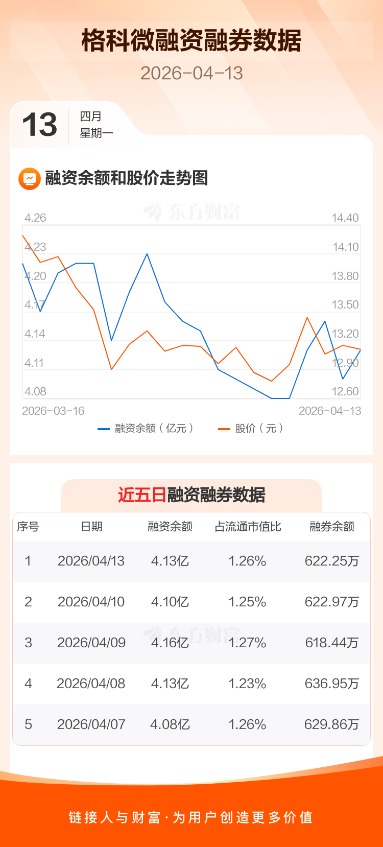 交易所最新数据显示,格科微于2026年4月13日获融资买入1227.12万元,融资偿还870.95万元,当日融资净买入356.17万元。目前,该股融资余额4.13亿,占流通市值比例为1.26%。