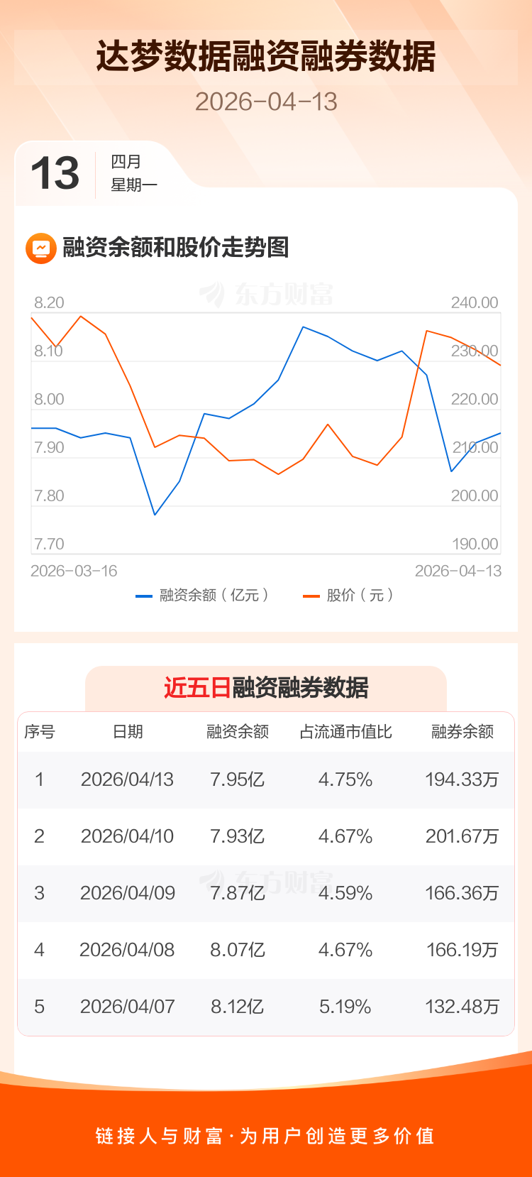 交易所最新数据显示,达梦数据于2026年4月13日获融资买入2354.85万元,融资偿还2177.34万元,当日融资净买入177.5万元。目前,该股融资余额7.95亿,占流通市值比例为4.75%。