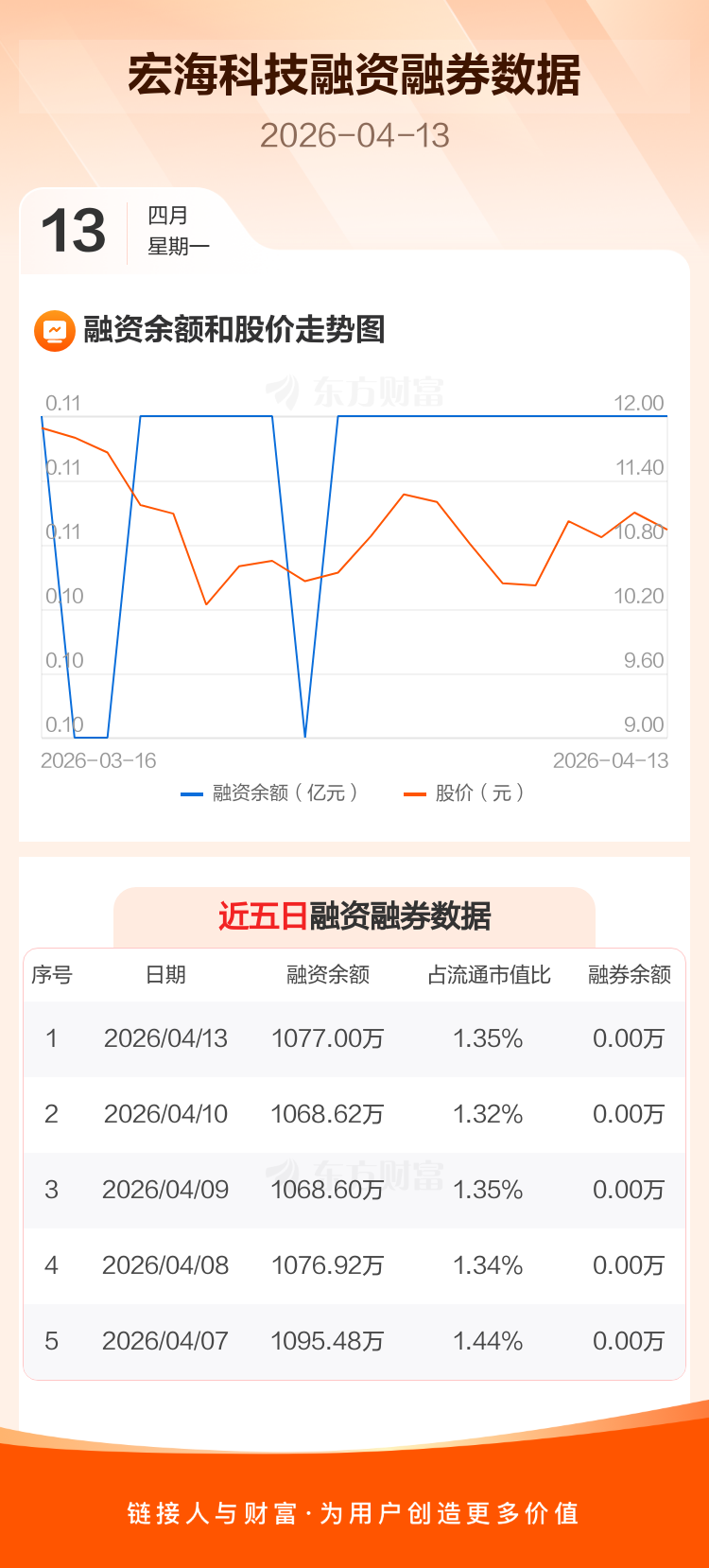 交易所最新数据显示,宏海科技于2026年4月13日获融资买入9.74万元,融资偿还1.36万元,当日融资净买入8.38万元。目前,该股融资余额1077.00万,占流通市值比例为1.35%。