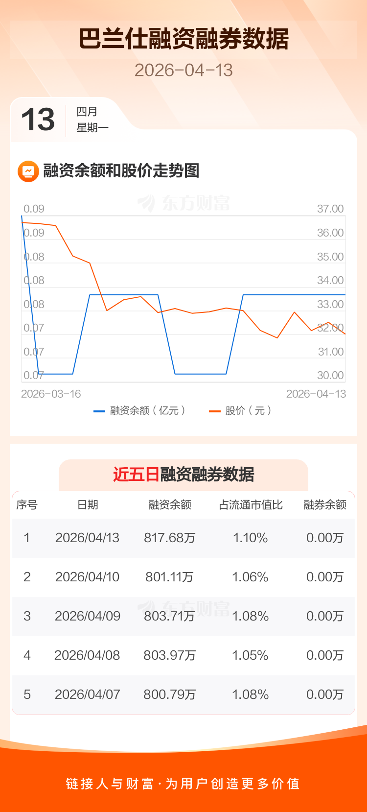 交易所最新数据显示,巴兰仕于2026年4月13日获融资买入39.91万元,融资偿还23.33万元,当日融资净买入16.58万元。目前,该股融资余额817.68万,占流通市值比例为1.10%。