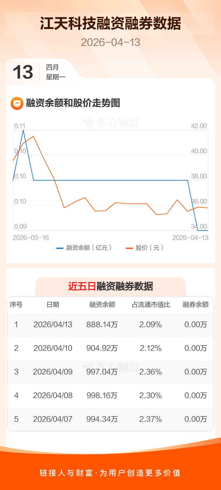 交易所最新数据显示,江天科技于2026年4月13日获融资买入20.01万元,融资偿还36.79万元,当日融资净偿还16.78万元。目前,该股融资余额888.14万,占流通市值比例为2.09%。