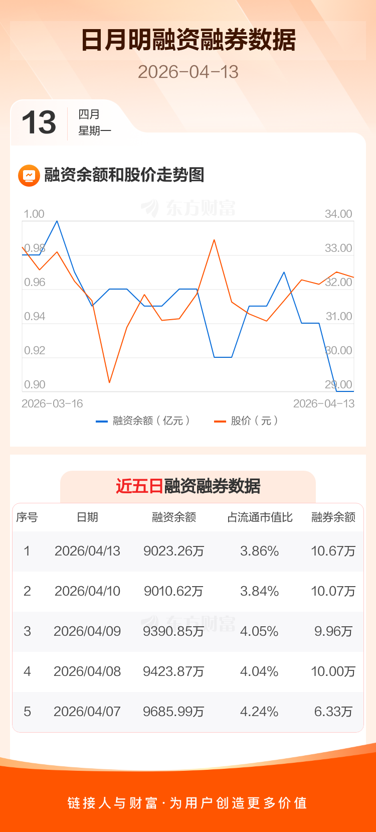 交易所最新数据显示,日月明于2026年4月13日获融资买入200.99万元,融资偿还188.35万元,当日融资净买入12.64万元。目前,该股融资余额9023.26万,占流通市值比例为3.86%。