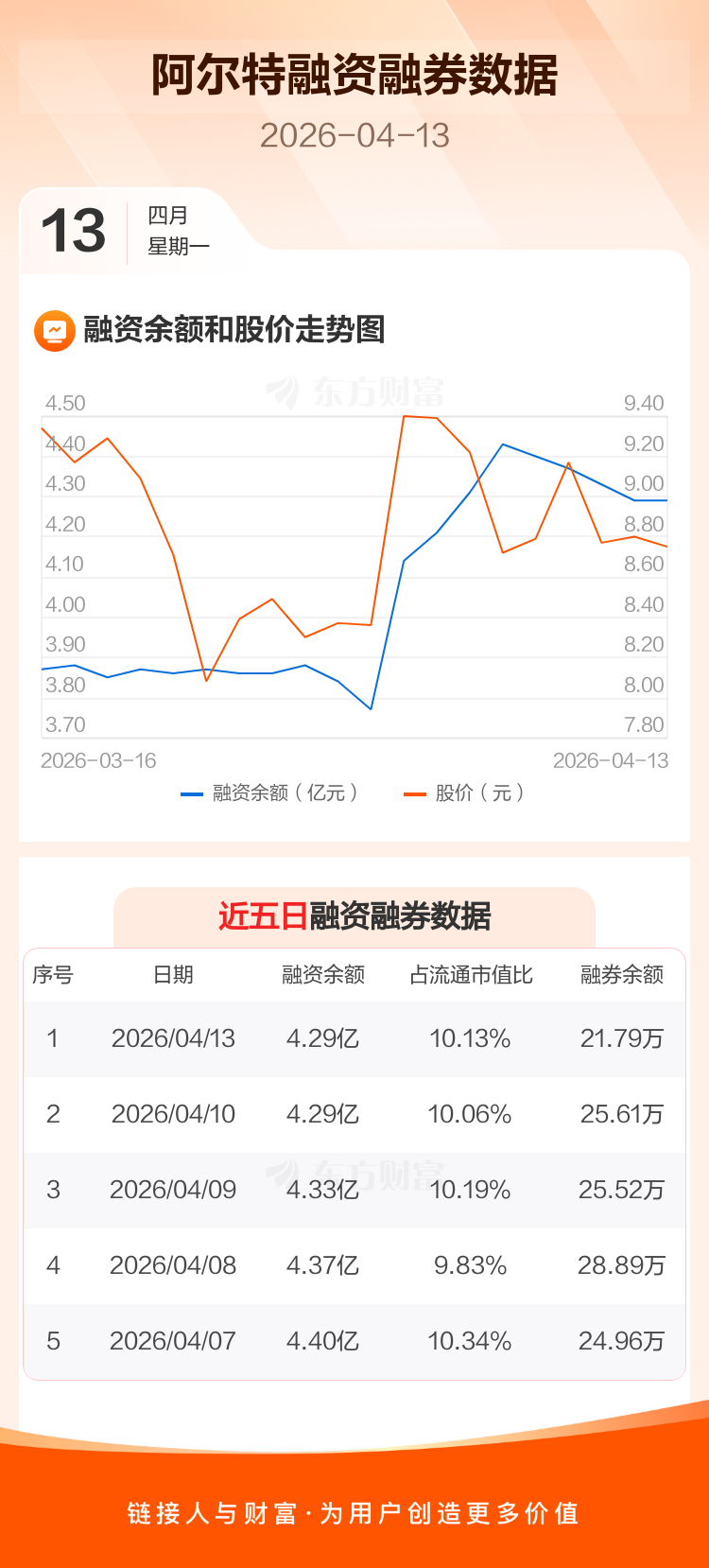 交易所最新数据显示,阿尔特于2026年4月13日获融资买入338.75万元,融资偿还273.62万元,当日融资净买入65.13万元。目前,该股融资余额4.29亿,占流通市值比例为10.13%。