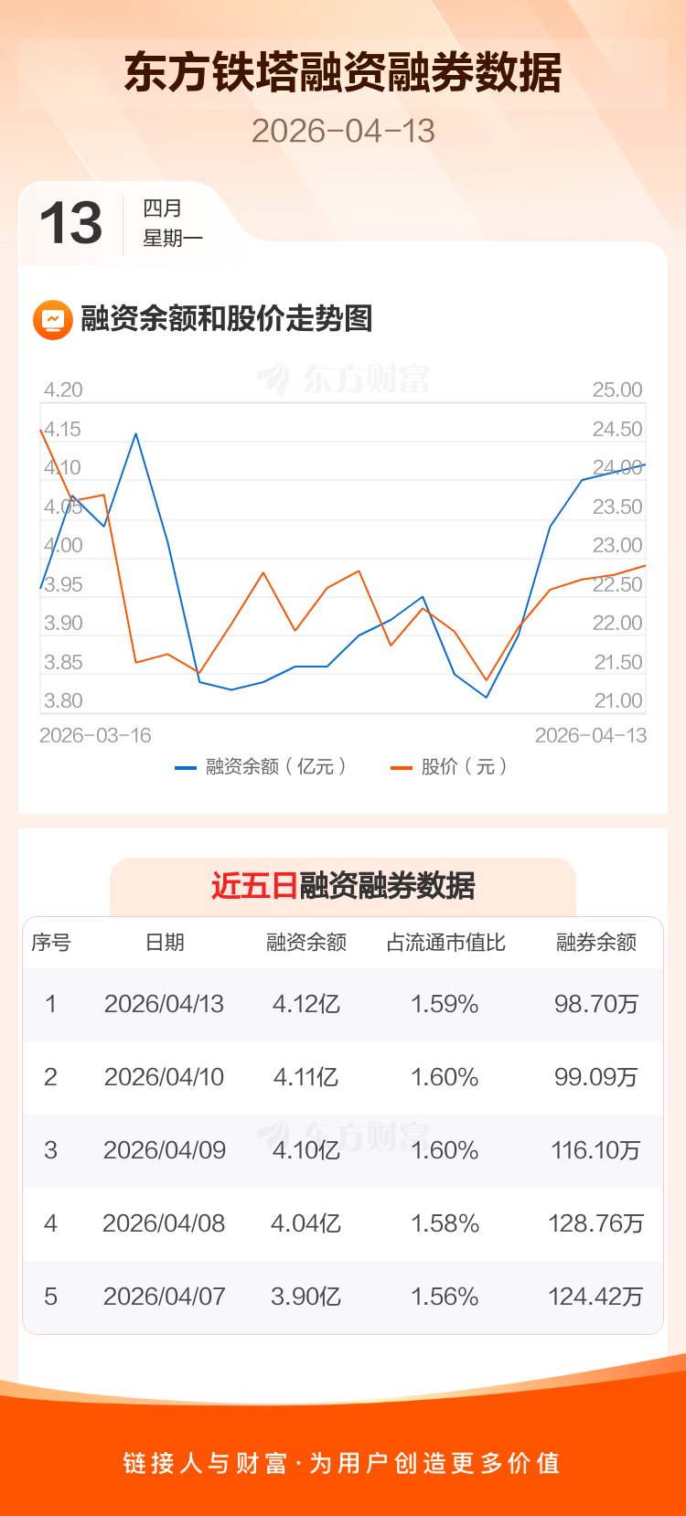 交易所最新数据显示,东方铁塔于2026年4月13日获融资买入2151.18万元,融资偿还2081.04万元,当日融资净买入70.15万元。目前,该股融资余额4.12亿,占流通市值比例为1.59%。