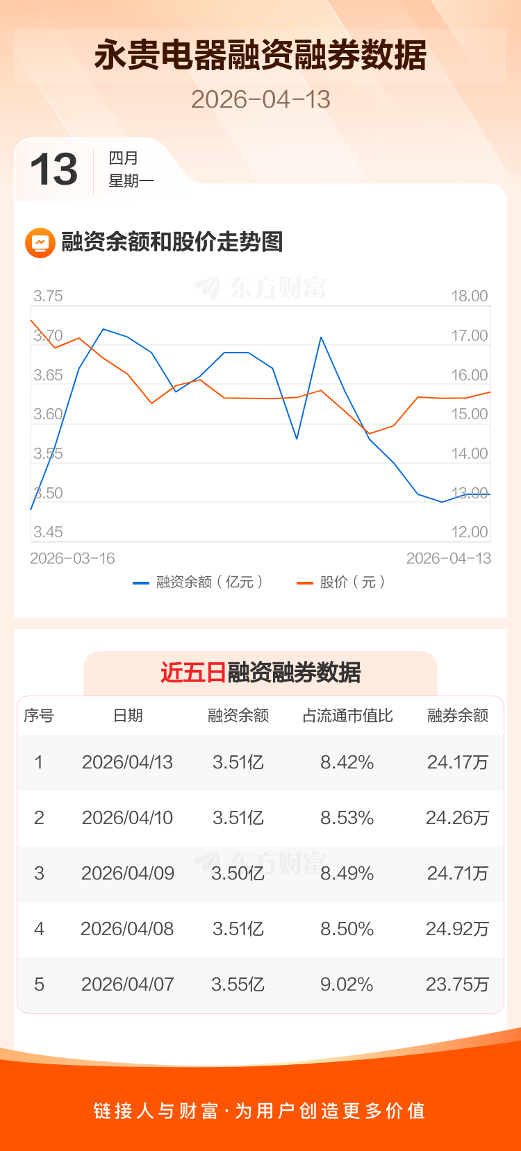 交易所最新数据显示,永贵电器于2026年4月13日获融资买入871.86万元,融资偿还954.85万元,当日融资净偿还83万元。目前,该股融资余额3.51亿,占流通市值比例为8.42%。